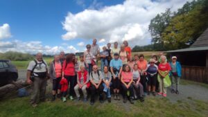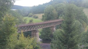 An der Stadthalle in Homberg/Ohm starteten 30 Interessierte, um das „Sagenhafte Schächerbachtal“ zu erkunden. Der erste imposante Ausblick erfolgte auf das Baudenkmal Eisenbahnbrücke hoch über dem Flüsschen Ohm, die um das Jahr 1900 gebaut wurde. Züge fahren aber schon lange nicht mehr über die Brücke.