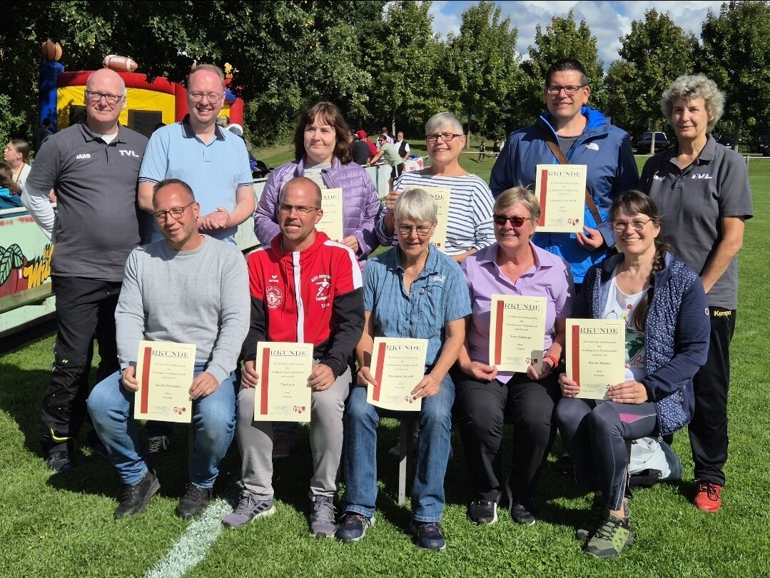 Mit Unterstützung von Dr. Julien Neubert ehrten die Präsidiumsmitglieder Wiltrud Rabenau und Lutz Wagner langjährige Mitglieder für über 25-jährige Vereinszugehörigkeit, während die Kinder sich auf der beliebten Hüpfburg und mit den Geräten aus der TV-Spielebox vergnügten.