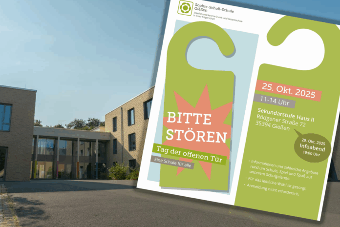 Gießen – Am Samstag, den 25. Oktober 2025, lädt die Sophie-Scholl-Schule von 11 bis 14 Uhr zum Tag der offenen Tür in der Sekundarstufe, Haus II, Rödgener Straße 72 in Gießen ein. Unter dem Motto „Bitte stören – eine Schule für alle“ können interessierte Besucherinnen und Besucher das Schulleben in seiner ganzen Vielfalt kennenlernen. Neben Führungen durch das Schulgebäude für Kinder und Erwachsene gibt es zahlreiche Mitmach-Angebote in Klassen- und Fachräumen, die von Lehrkräften und Schüler*innen gestaltet werden. Spiele, kreative und handwerkliche Tätigkeiten sowie spannende Einblicke in die Fachbereiche bieten Gelegenheit, Schule hautnah zu erleben. Auf dem Schulgelände sorgt außerdem ein kleines Angebot an Speisen und Getränken für eine entspannte Atmosphäre. Eine Anmeldung ist nicht erforderlich.