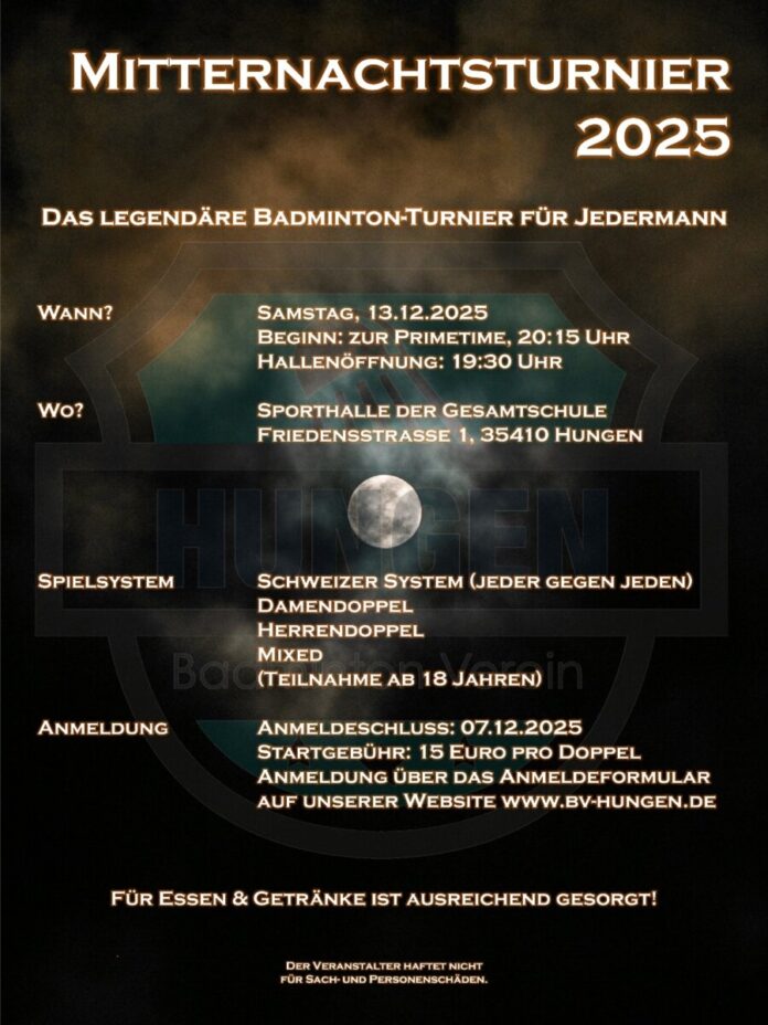Auch dieses Jahr veranstaltet der Badmintonverein aus Hungen am 13.12.2025 sein legendäres Mitternachtsturnier. Der Spaß steht bei dem geselligen Wettkampf im Vordergrund und jeder ab 18. Jahren kann mitmachen. Ob Hobby- oder Mannschaftspieler, Herrendoppel, Mixed oder Damendoppel, aufgrund des Schweizer System findet jeder mit der Zeit gleichstarke Gegner. Gespielt wird also in Doppelpaarungen – unabhängig vom Geschlecht. Auch in diesem Jahr gibt es zusätzlich einen Kostümwettbewerb. Jeder verkleidete Spieler erhält dazu auch ein Freigetränk.