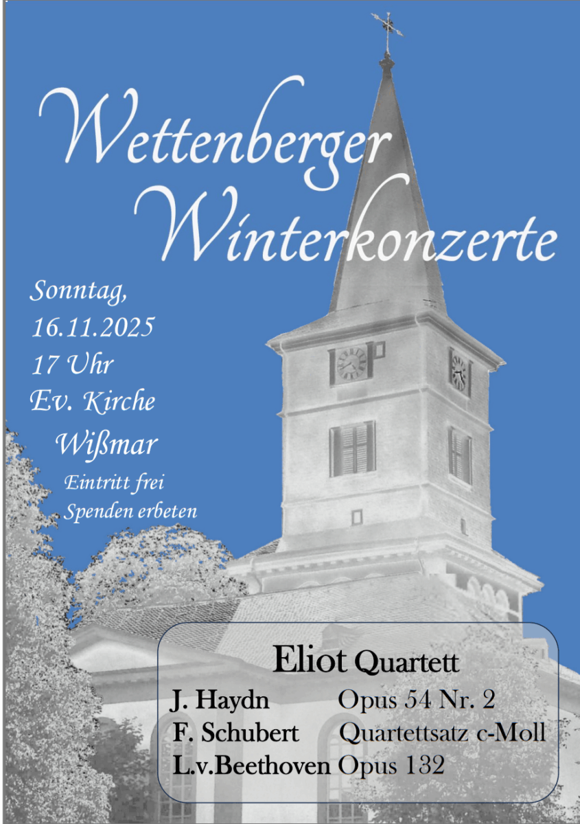 Die Saison 2025/2026 ist eine ganz besondere. Das Eröffnungskonzert am 16. November 2025 wird das 150. Wettenberger Winterkonzert. Umso schöner, dass mit dem Eliot-Quartett zu diesem Anlass „eines der besten Streichquartette Deutschlands“ (FAZ) in Wißmar gastiert. Noch schöner, dass es Beethovens Streichquartett op. 132 mitbringt. Dieses Stück würde es mühelos auf jede Shortlist der größten, tollsten, besten Kammermusikwerke schaffen. Davor gibt es ein virtuoses Haydn-Quartett (op. 54,2) und mit Schuberts Quartettsatz quasi seine andere „Unvollendete“.