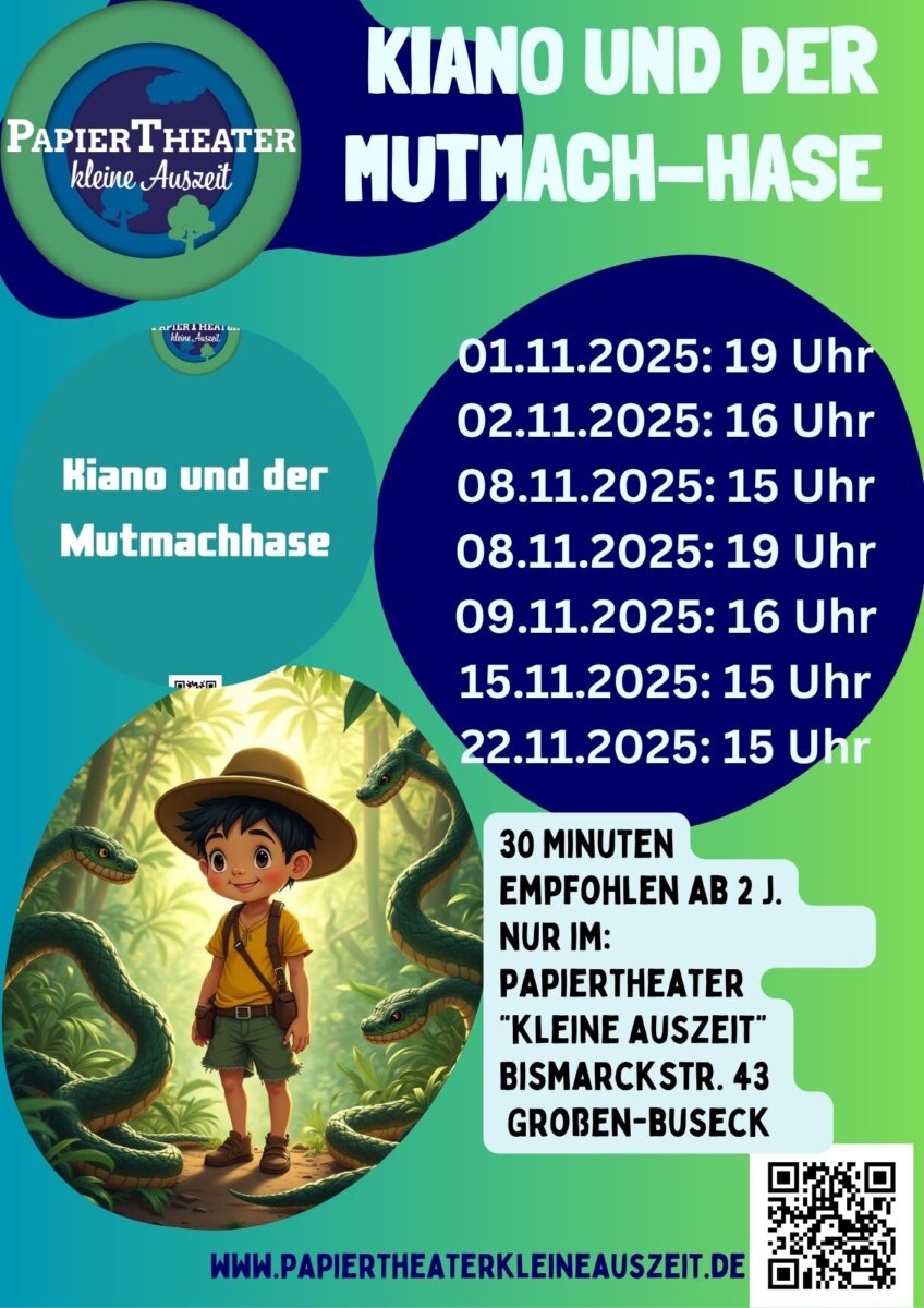 Mit „Kiano und der Mutmach-Hase“ erwartet das Publikum ein spannendes und liebevoll gestaltetes Abenteuerstück für Kinder ab 4 Jahren – gespielt im einzigartigen Format des Papiertheaters.