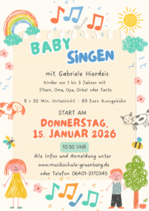 Unser Kurs gibt Ideen und Anleitung und richtet sich an Kinder von 1 bis 3 Jahren. Jede der acht Unterrichtseinheiten mit Kursleiterin Gabriele Hierdeis dauert 30 Minuten. Start ist Donnerstag, 15. Januar 2026 um 10:30 Uhr im Raum 1 der Musik- und Kunstschule Grünberg. Bitte bringen Sie eine Decke für sich und Ihr Baby mit. Anmeldung gerne über die Homepage