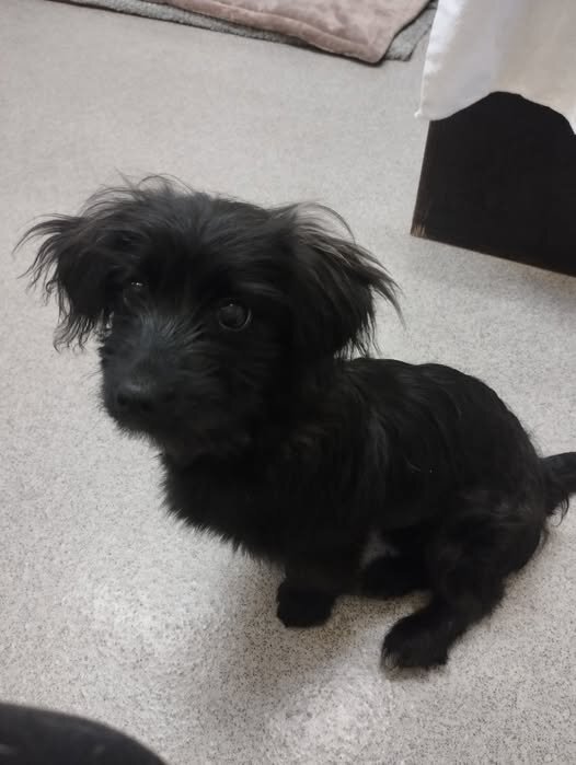 Fee (Mischling, geboren im Juni 2025) ist erst seit ein paar Tagen bei uns im Tierheim. Die kleine schwarze Hündin ist anfangs ein bisschen schüchtern, dann aber offen im Menschenkontakt und freut sich, wenn man das Zimmer betritt.