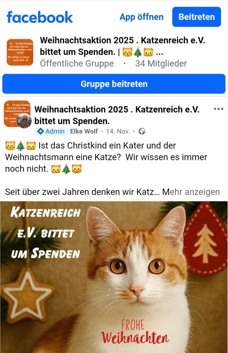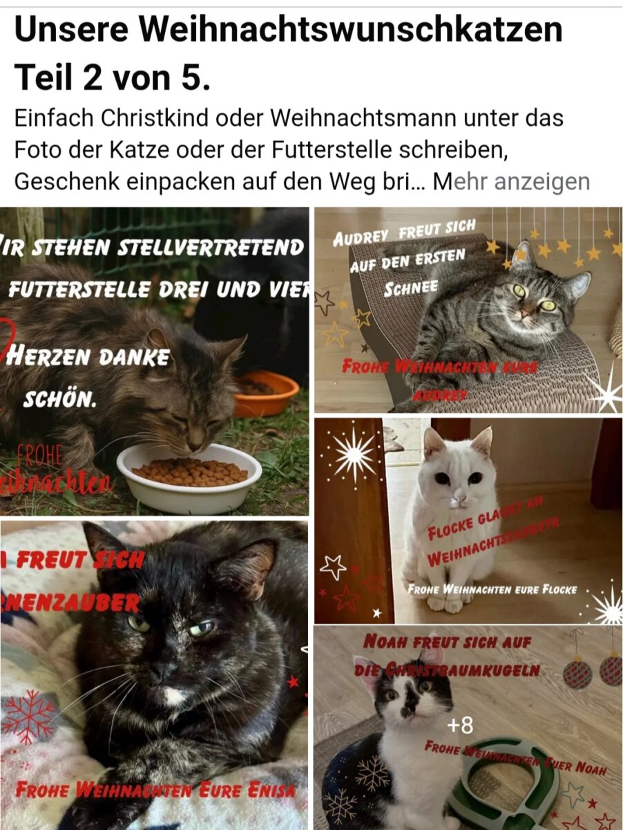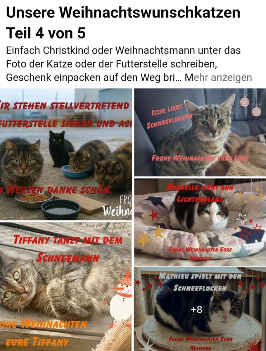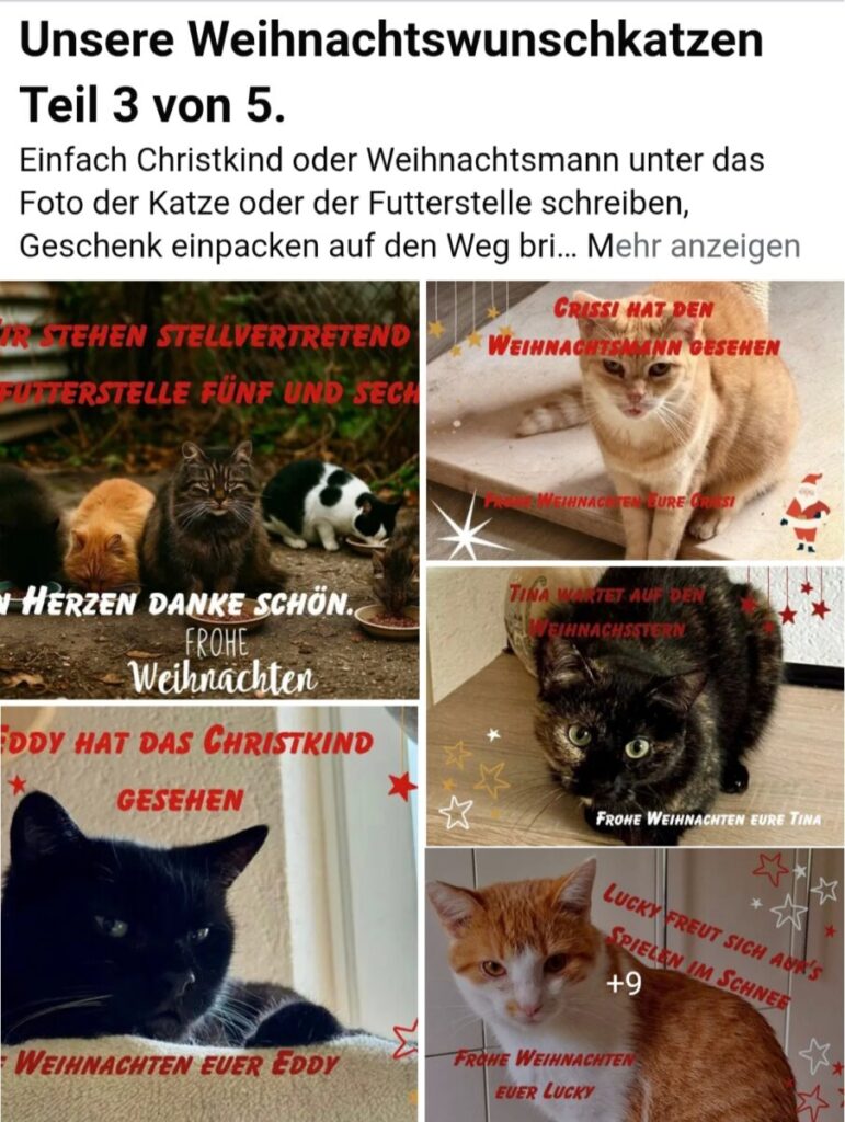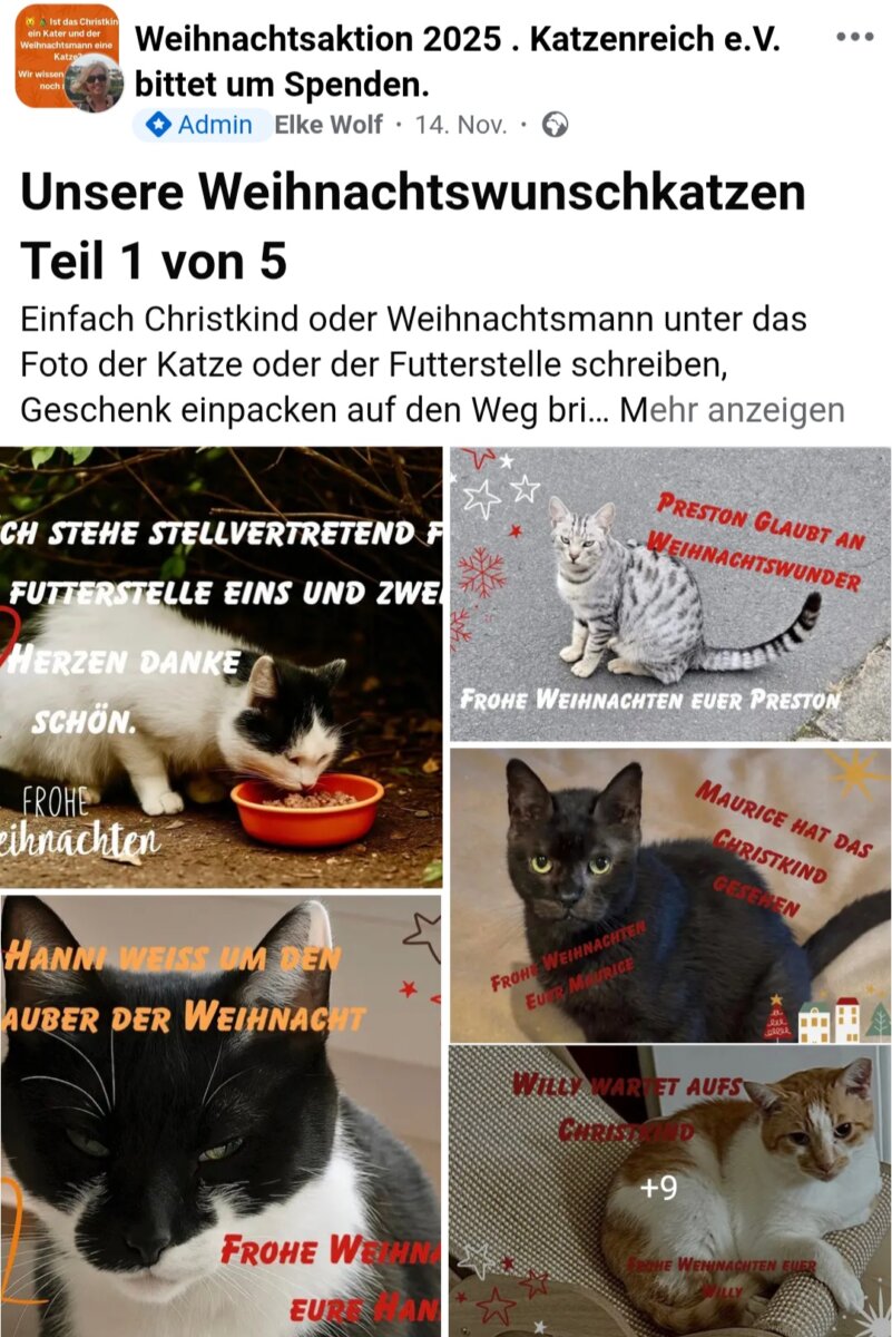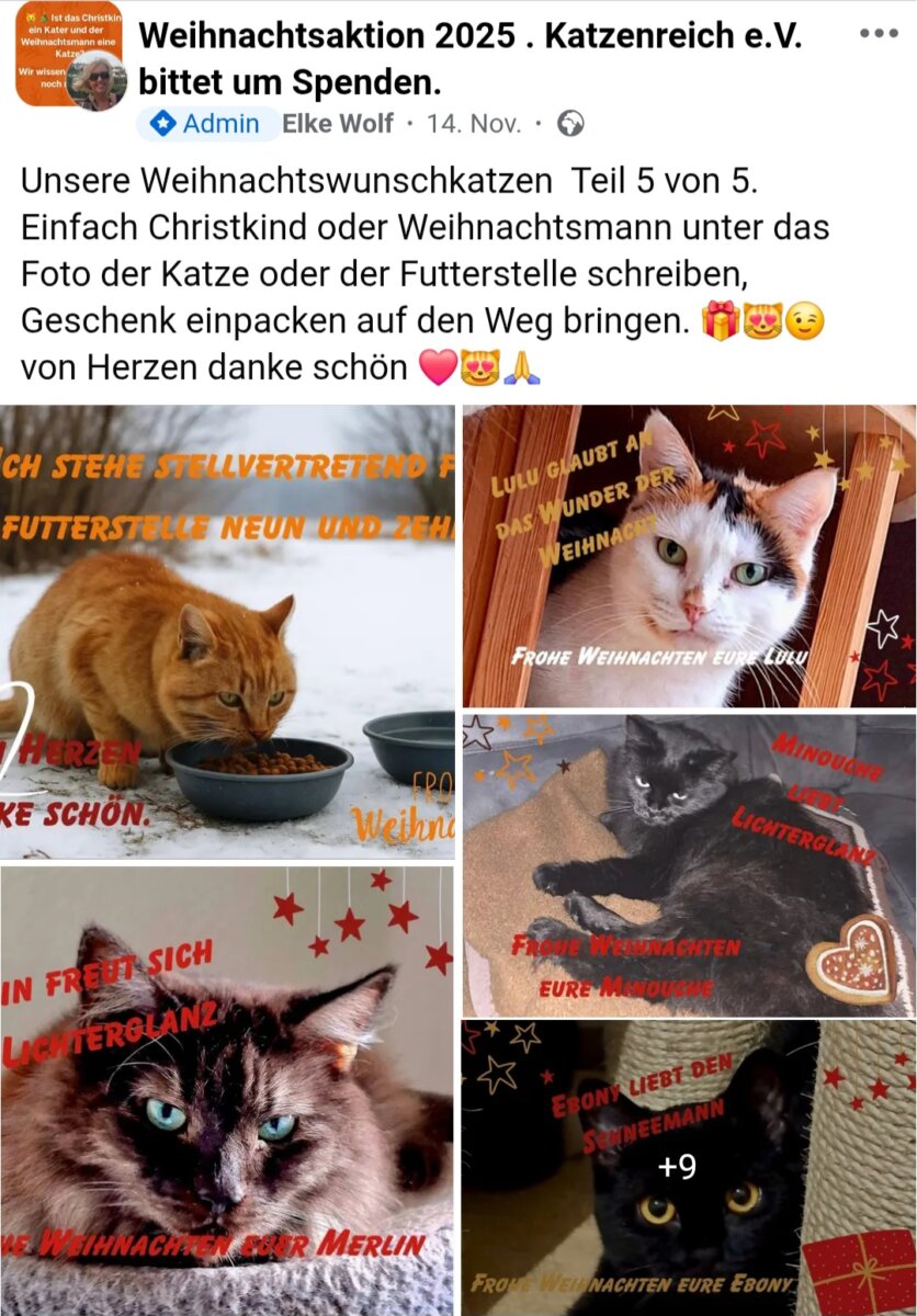 Wie auch im letzten Jahr hat Katzenreich e.V. wieder eine Spendenaktion in Facebook gestartet. Ist das Christkind ein Kater und der Weihnachtsmann eine Katze ? Wir wissen es immer noch nicht. Wir stellen die Katzen vor die sich über Spenden jeder Art freuen und sie bedanken sich auch dafür. Wer bei Facebook ist, bitte mal nachschauen und sich über die schöne Spendenaktion informieren.