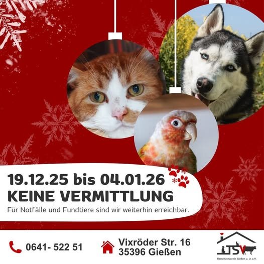 Vermittlungspause vom 19.12. bis 04.01.2026 im Tierheim Gießen