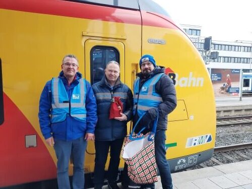 Dieses Jahr war das Geschenk von PRO BAHN Hessen an den etwas größeren „roten Beutelchen“ erkennbar, die wir am Nachmittag des 24.12.2025 überreichten. Ob Triebfahrzeugführerinnen und -führer, Bedienstete der DB Information, Zugbegleiterinnen und -begleiter, Reinigungsdienste, Bedienstete von DB Sicherheit, Menschen, die anderweitig an den Bahnhöfen im Einsatz sind, sie alle freuten sich sehr darüber, dass wir als Fahrgastverband an sie dachten.