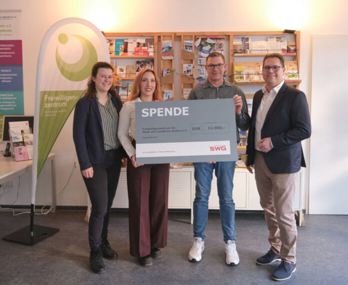 Eva Weidenfeld, Koordinatorin eines Projekts des Freiwilligenzentrums (ganz links), und Geschäftsführerin Katharina Traoré nahmen den symbolischen Spendenscheck entgegen, den SWG-Unternehmenssprecher Ulli Boos (ganz rechts) und Marco Krause aus der Abteilung Metering-Services bei den SWG vorbeibrachten.