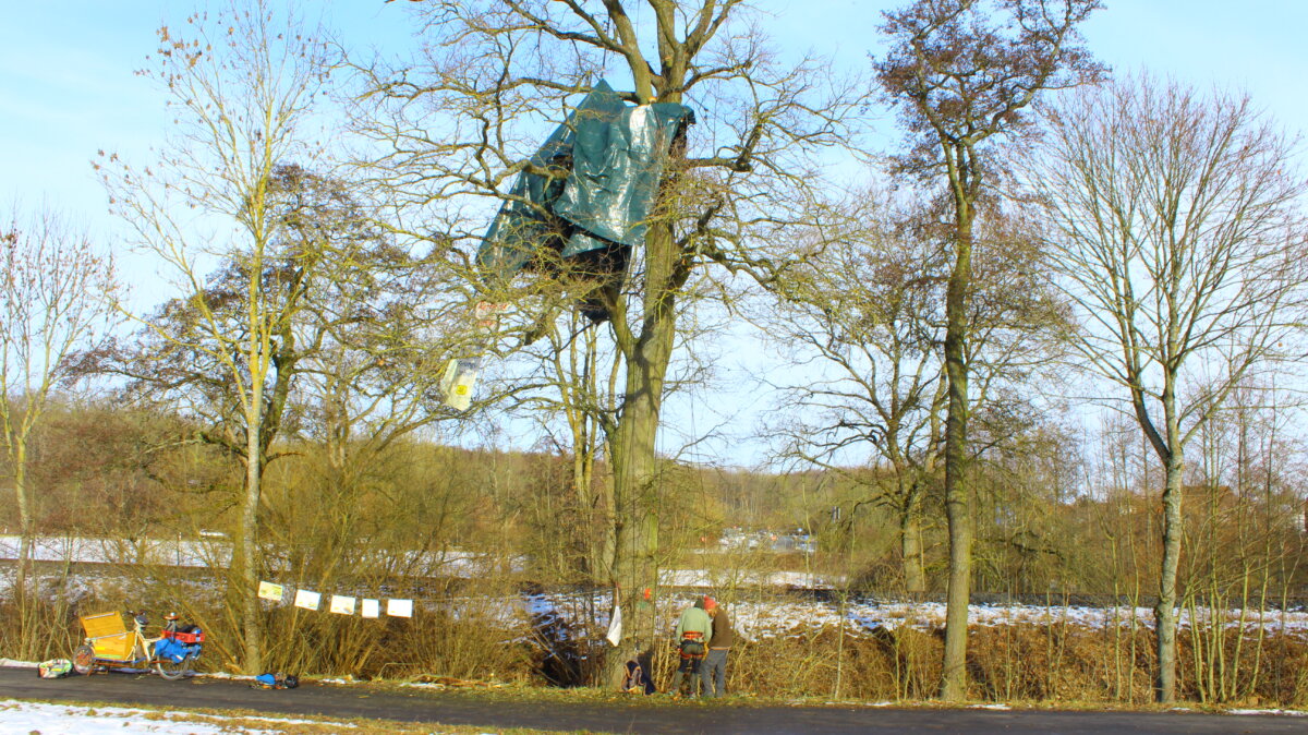 Während der Baumfällsaison, die bis Ende Februar andauert, wird diese Plattform Tag und Nacht „bewohnt“ sein. Die Initiative lädt täglich um 16 Uhr ein zur Unterstützung und zum Austausch über Ideen zu weiteren Protestaktionen.