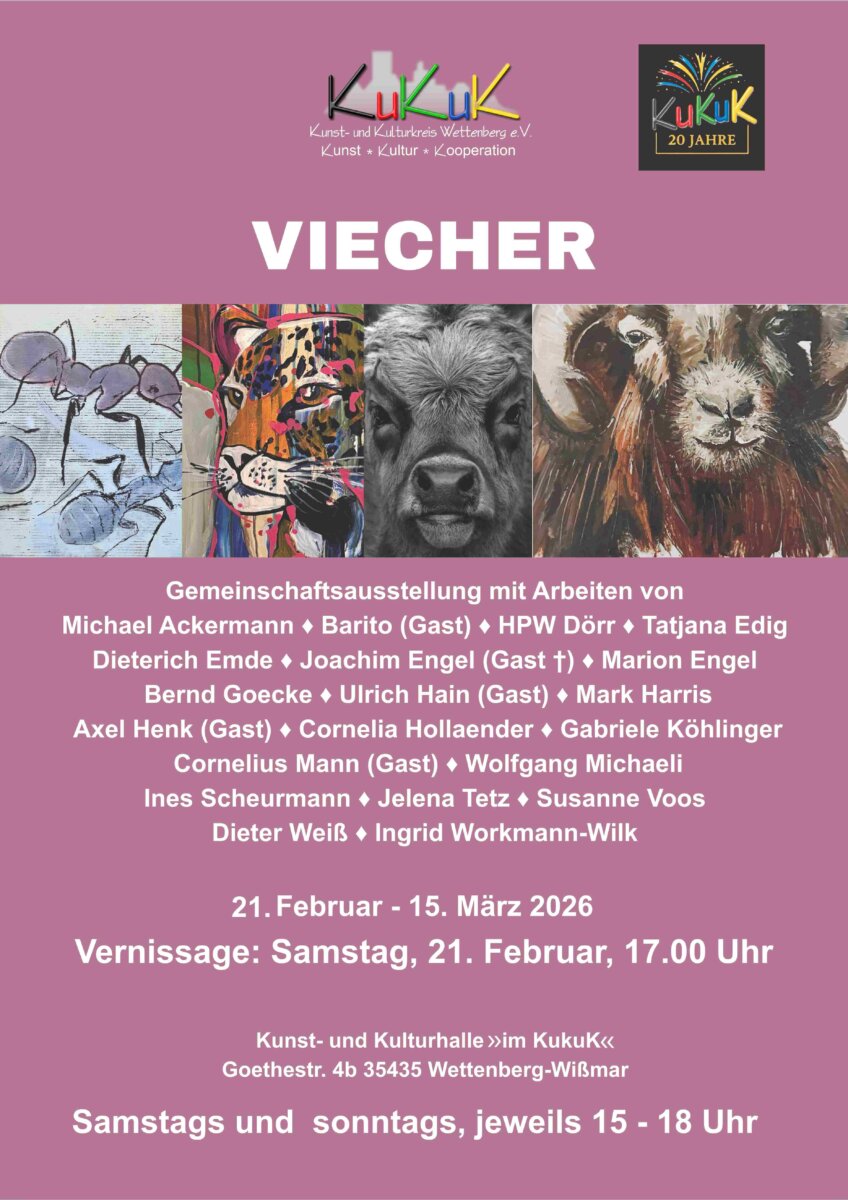 Am 21. Februar eröffnet der KuKuK (Kunst- und Kulturkreis Wettenberg) seine neue Ausstellung mit dem Titel: “Viecher”. Das klingt ein bißchen merkwürdig, denn wenn Tiere als “Viecher” bezeichnet werden, ist das oft nicht sehr freundlich, sondern eher herabsetzend gemeint: “Olle Viecher”.