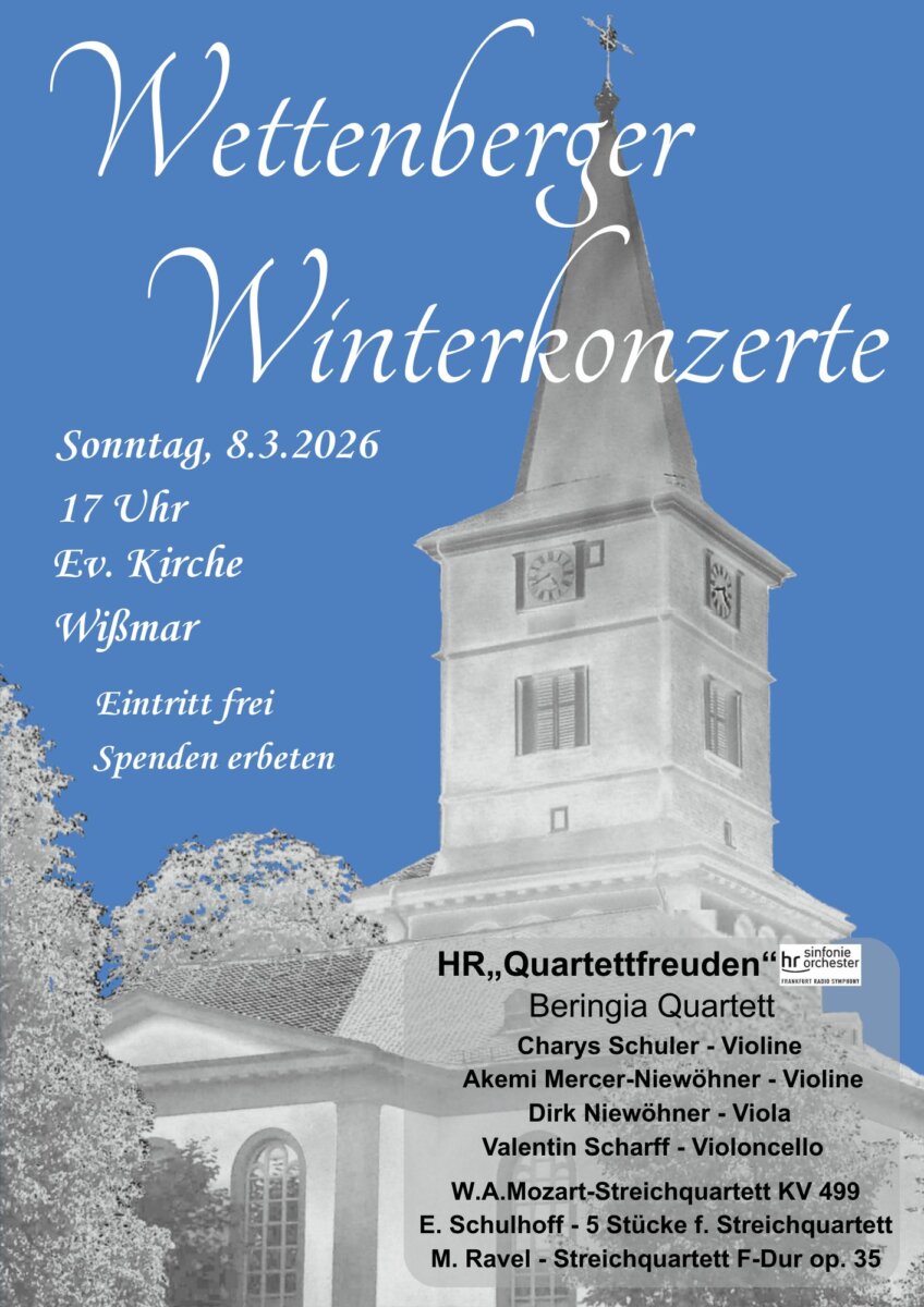 40 Jahre und bisher 149 Konzerte sind die stolze Zwischenbilanz der Wettenberger Winterkonzerte in der evangelischen Kirche Wißmar. Von der Krofdorferin Ilse Bergner zusammen mit engagierten Mitstreiterinnen und Mitstreitern ehrenamtlich organisiert und von der Gemeinde Wettenberg und der Kirchengemeinde Wißmar tatkräftig unterstützt, hat sich die Reihe – immer sonntags um 17 Uhr – zu einem festen Bestandteil des mittelhessischen Musiklebens entwickelt. Hochkarätige Musiker, die teilweise von weither anreisen, treffen auf ein neugieriges Publikum, darunter immer sehr viele Wettenberger. Hier ist Klassik keine Hürde, sondern eine Herzensangelegenheit.