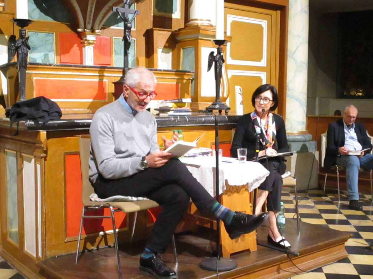 Caiati führte ein zweisprachiges Gespräch mit Carofiglio, das sich mit der Lesung treffender Passagen aus der deutschen Version von „Der Horizont der Nacht“ durch Jörg Braunsdorf abwechselte. Das Publikum konnte damit weitere Details über das Verfassen von Carofiglios Romanen und etwas mehr über seine Person und seine Einstellungen zu den in seinen Werken wiederkehrenden Themen entdecken.