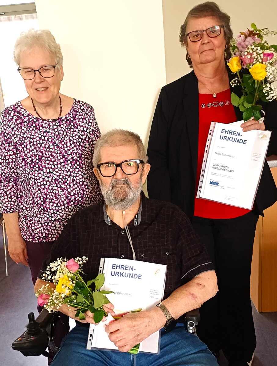 Langjährige Mitglieder wurden mit einem kleinen Geschenk geehrt und Seidler dankte ihnen für die Treue zum VdK. 25 Jahre Mitglied sind Friedhold Braungart, Helga Svojanowski und Irmtraud Hofmann (fehlte entschuldigt).