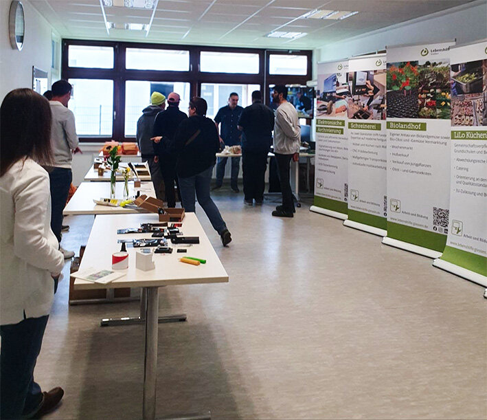 An Infoständen im Haus stellten Mitarbeitende der Werkstätten und Abteilungen ihre Arbeitsbereiche vor – von der Metallverarbeitung über Schreinerei und Wäscherei bis zur Forstwirtschaft. Der Tag richtete sich besonders an junge Menschen mit Förderbedarf, die beim Einstieg in die Arbeitswelt oft auf Hürden stoßen, die andere nicht kennen.