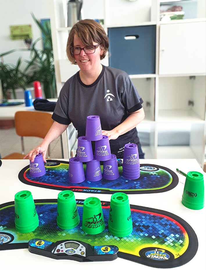 Zum Rahmenprogramm gehörte auch die Vorstellung von Nina Laucht, die mehrfach ausgezeichnete Speedstackerin. Mit beeindruckender Schnelligkeit stapelte sie Becher – und lud Besucher*innen ein, es selbst zu versuchen.