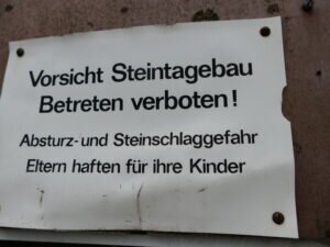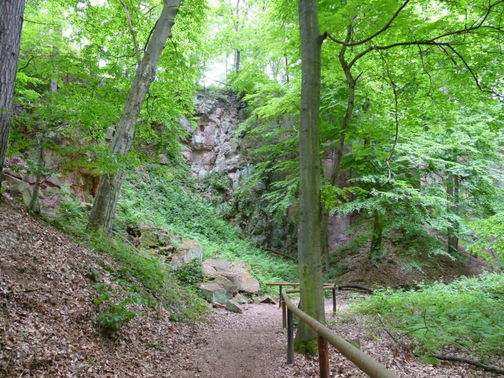 Man kann in den aufgegebenen Steinbrüchen herumlaufen in den dafür angelegten Wegen. Die Natur hat sich den freigelegten Stein schon wieder erobert mit Bewuchs von Moosen und Bäumen.