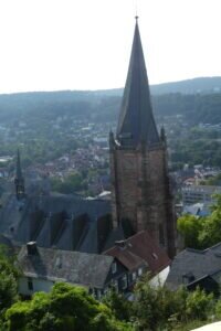 Vom Bahnhof führte der Weg zunächst über die Elisabethbrücke an der Elisabethkirche vorbei zum Marburger Landgrafenschloss. Im Schlosspark hielt Pfarrer Norbert Heide eine Andacht zur Tageslosung. Aller Anfang ist schwer. Man stößt immer wieder an seine Grenzen und muss diese überwinden. Mit Gott kann man über Mauern springen.
