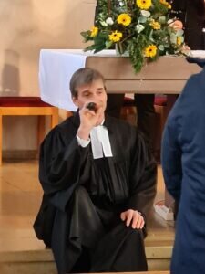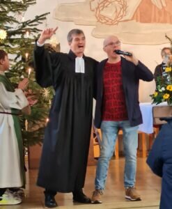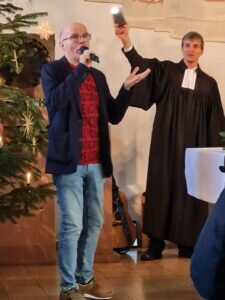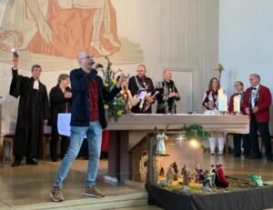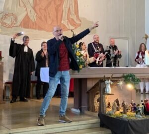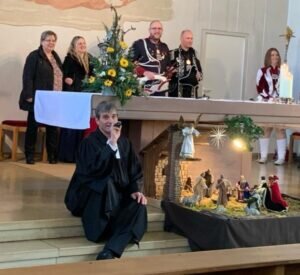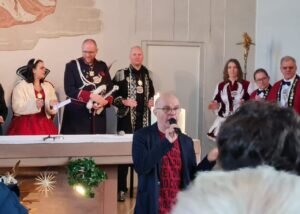 Der ökumenische Faschingsgottesdienst am vergangenen Sonntag in Hungen war in mehrfacher Hinsicht ein besonderer. Der Hungener Carnevalverein, der ihn zusammen mit der evangelischen und der katholischen Kirchengemeinde veranstaltet, steht im närrischen Jubiläumsjahr. Seit seiner Gründung sind 66 Jahre vergangen. In der aktuellen Kampagne werden die Hungener Narren von den Tollitäten Andreas I. und Tatjana I. mit Hofmarschall David. I. und Hofdame Franziska I. regiert. Sie sind zusammen mit weiteren am Gottesdienst Beteiligten im Anschluss an die Ministranten der Pfarrgemeinde in die Kirche St. Andreas eingezogen. Besonders war dieser Gottesdienst auch, weil mit Klaus Dieter Oppler der Initiator der Hungener Faschingsgottesdienste dabei war. Auf seinen Anstoß hin fand auf den Tag genau 17 Jahre zuvor der erste dieser Art in Hungen statt. „KDO“, wie der frühere Sitzungspräsident der Hungener Prunksitzung genannt wird, hat zu diesem Anlass den „Stern, der deinen Namen trägt“ besungen – wie schon einmal in einem Faschingsgottesdienst, über den seinerzeit der Hessische Rundfunk berichtete. Das Lied widmete er Pfarrer Marcus Kleinert. Der – das ist die dritte Besonderheit – feierte nämlich seinen vorerst letzten Gottesdienst mit der Hungener Kirchengemeinde. Nach seiner offiziellen Verabschiedung am Sonntag zuvor wird er ab 1. Februar eine neue Stelle im Zentrum Verkündigung der Evangelischen Kirche in Hessen und Nassau antreten. Seine Predigt trug er in gereimter Form vor – in der Hoffnung, dass die Zuhörenden so nicht einschlafen würden. Zum Abschied sang er ebenfalls einen Hit aus einer vergangenen Kampagne. Bei „Über sieben Bänke muss ich sehn und dann seh ich da die Uschi stehn“ sangen die Besucherinnen und Besucher des Gottesdienstes mit. Im bunten Faschingstreiben galt es noch eine Verabschiedung zu würdigen. Erzieherin Stefanie Peppler, die über 30 Jahre in der evangelischen Kindertagesstätte Hungen gearbeitet hatte, wechselt ebenfalls die Stelle. Sie wurde mit viel Dank und Anerkennung vom Kirchenvorstand verabschiedet. Yvonne Ulsamer, Kirchenvorsteherin im Kindertagesstättenausschuss, betonte die professionelle und gleichzeitig warmherzige Art, mit der Stefanie Peppler so viele Kinder förderte. Musik und Sprachentwicklung waren ihre Schwerpunkte. Mit bewegenden Worten dankte die Erzieherin für die Zeit in Hungen. Manches Mal hätten Familienmitglieder sich gewundert über Dinge, die sie zu Hause für die Kinder vorbereitet hat. Martin Sahm, der katholische Pfarrer, war leider erkrankt und konnte nicht am Gottesdienst teilnehmen. Aus der katholischen Pfarrgemeinde wirkten Pastoralreferentin Andrea Schwade und Pfarrgemeinderatsmitglied Maria Seibert mit.