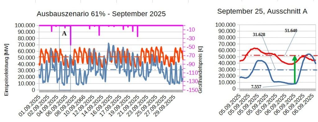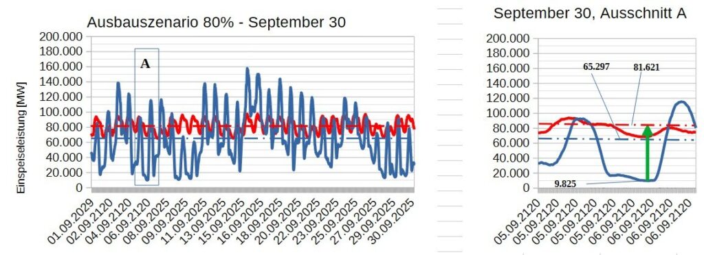 Bild 2: Verläufe von Stromerzeugung aus Ökoenergie und Stromverbrauch September 2030, hochgerechnet aus September 2025 entsprechend Planungsziel des BMWK für 2030 [4]; rechts Ausschnitt A mit größtem Reservebedarf max EK (grüner Pfeil).