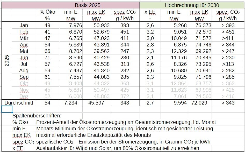 Aus den Diagrammen (Bilder 1 und 2)  gehen die Erzeugungsschwankungen des Ökostroms hervor. Aus  Gründen der Netzsicherheit und der Versorgungssicherheit sind daher unterschiedliche Ausgleichsmaßnahmen unerlässlich. Der Preis dafür ist ein Großhandels-Strompreis auf hohem Niveau. Im Jahr 2024 betrug er im Durchschnitt 7,9 ct/kWh und Ende September 2025 lag er bei 9 ct/kWh. Als Maß für den schon erreichten und den weiteren Ökostromausbau wird das Verhältnis von durchschnittlicher Stromerzeugung zum durchschnittlichem Stromverbrauch genommen. Wegen fehlender Speicherinfrastruktur folgen daraus zwangsläufig Überkapazitäten bei Erzeugungsspitzen, deren Anzahl und Größe mit dem Ausbau ansteigen. Im Idealfall sind sie gerade so groß, dass sich rein rechnerisch das gewünschte Verhältnis von Erzeugung zu Verbrauch ergibt. Für die erreichten Verhältnisse sowie weitere Kennzahlen siehe Tabelle 1. Zu beachten ist die spezifische CO2-Emission. Sie betrug für den Monat September 285 Gramm je Kilowattstunde Stromerzeugung (g/kWh). Der Durchschnitt für das Gesamtjahr kann unter der Voraussetzung gleicher Umweltbedingungen wie im Vorjahr mit 343 g/kWh prognostiziert werden. Das ist im europäischen Maßstab noch viel zu hoch. Deutschland folgt damit  dem europäischen Emissions-Spitzenreiter Polen.