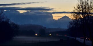 Nebelschwaden ziehen über die Wiesen, nahe dem Äschersbach. Aufnahmestandpunkt: Lauterer Straße in Süd-/westl. Richtung, Baumgartenfeld / Queckborn.