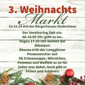Am 14. Dezember beim Niederkleener Adventsmarkt ist der Heimat- und Geschichtsverein Niederkleen e.V., wie alle anderen Niederkleener Vereine und unsere örtlichen Selbstvermarkter vertreten.