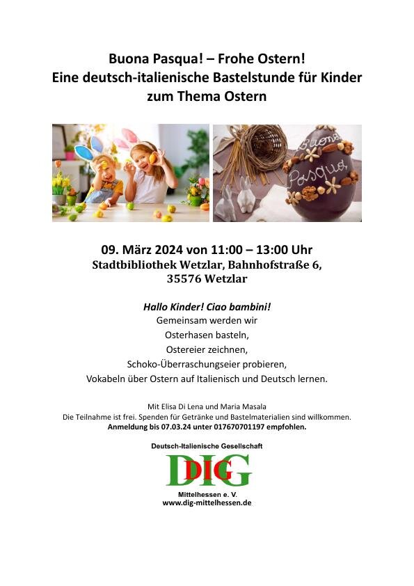 Zweisprachige Kinder „Bimbi bilingui“ aber auch alle anderen Kinder, die teilnehmen möchten, haben die Möglichkeit, mit Gleichaltrigen Spaß zu haben und dabei noch etwas Neues zu lernen. Die jungen DIG-Mitglieder Maria Masala und Elisa Di Lena werden mit den kleinen TeilnehmerInnen Osterhasen basteln und Ostereier zeichnen und malen. Außerdem können typische Schoko-Überraschungseier probiert werden, die Kinder in Italien zu Ostern bekommen. Dabei lernen die Kinder Ostern-Vokabeln auf Italienisch und Deutsch. Auch die Eltern dürfen mitmachen und können sich über neue Bekanntschaften freuen.