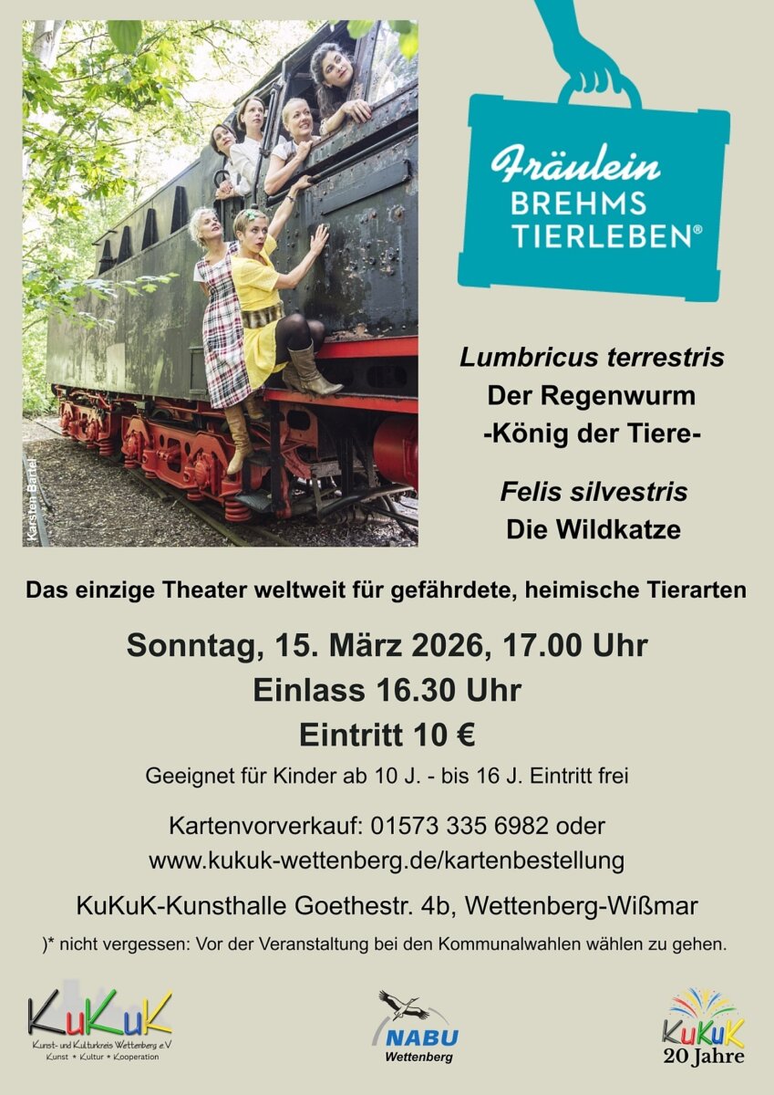 Am Sonntag, den 15. März 2026 um 17 Uhr kommt das einzige Theater weltweit für gefährdete, heimische Tierarten „Fräulein Brehms Tierleben“ in den KuKuK. In Kooperation mit NABU-Wettenberg findet das artgerechte Unterhaltung nicht nur für Erwachsene über gefährdete Tierarten, inszeniert mit den Wissenschaften an Fräuleins Seite, in der Kunsthalle, Goethestraße 4b in Wettenberg-Wißmar statt.