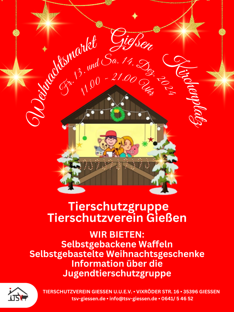 Die Jugendtierschutzgruppe des Tierschutzvereins Gießen lädt herzlich ein zum Weihnachtsmarkt in Gießen! Besuchen Sie unseren Stand und unterstützen Sie unsere Arbeit für den Tierschutz.