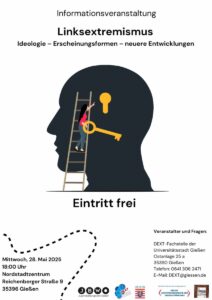 Gemeinsam bieten der Nordstadtverein Gießen, das Jugendbildungswerk und die DEXT-Fachstelle der Universitätsstadt Gießen am 28.05.2025 die Informationsveranstaltung „Linksextremismus – Ideologie, Erscheinungsformen, neuere Entwicklungen“ an.