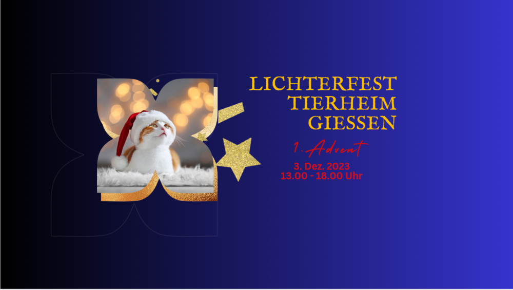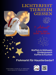 Das Lichterfest im Tierheim Gießen findet am 3. Dezember 2023, zum 1. Advent, statt. Die Veranstaltung bietet neben einem Tierflohmarkt verschiedene Leckereien wie Waffeln, Glühwein, Kinderpunsch, Kaffee und Kuchen an.