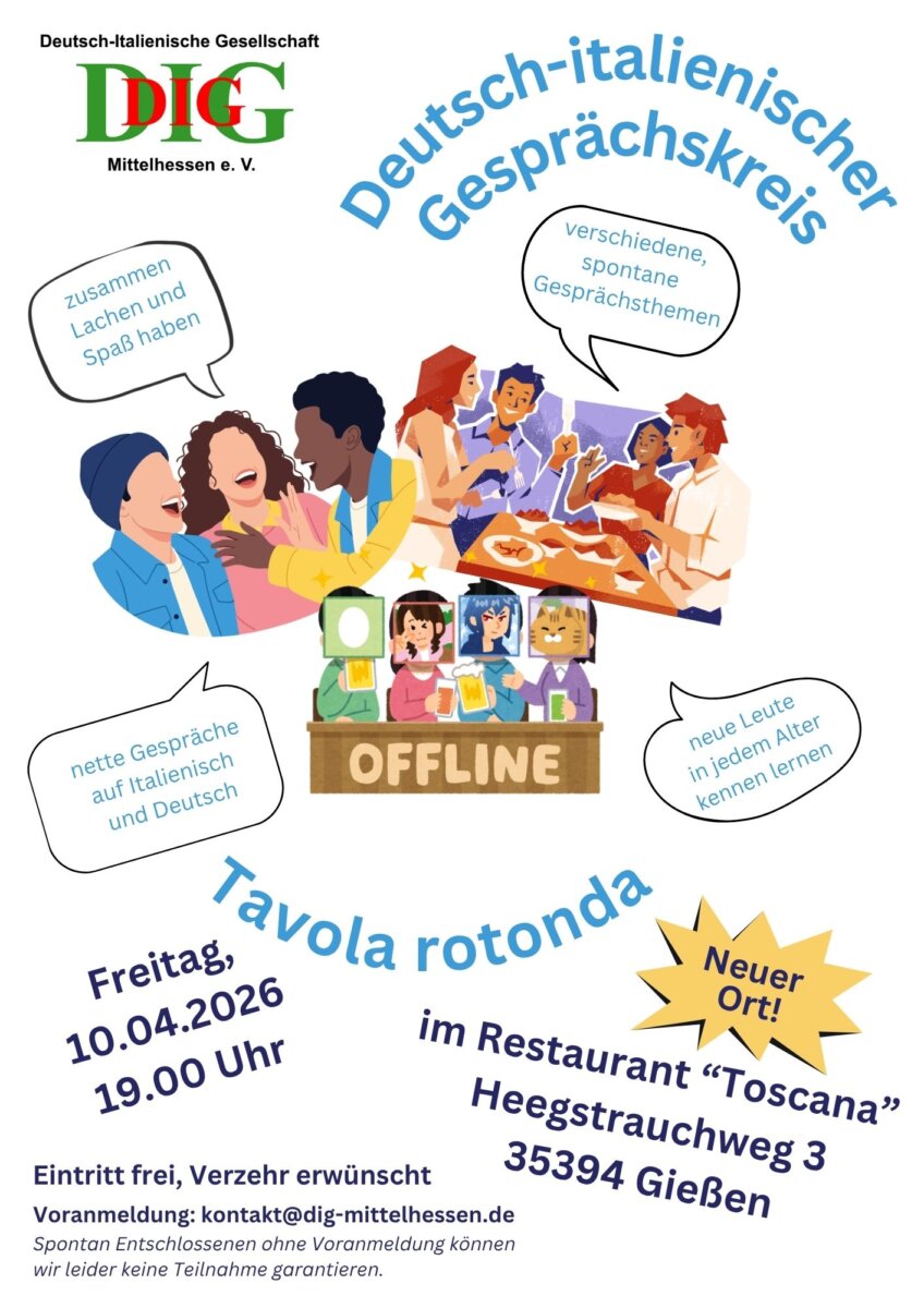19:00 - 22:00 Deutsch-italienischer Gesprächskreis / Tavola rotonda April 10 @ 19:00 - 22:00 Deutsch-italienischer Gesprächskreis / Tavola rotonda Nach einer kurzen Pause können wir unsere beliebten Treffen mit großer Freude an einem neuen Veranstaltungsort fortsetzen. Nach der Schließung vom Bistro Da Vinci, warten auf uns die Räumlichkeiten des […] Eintritt frei, Verzeher erwünscht.