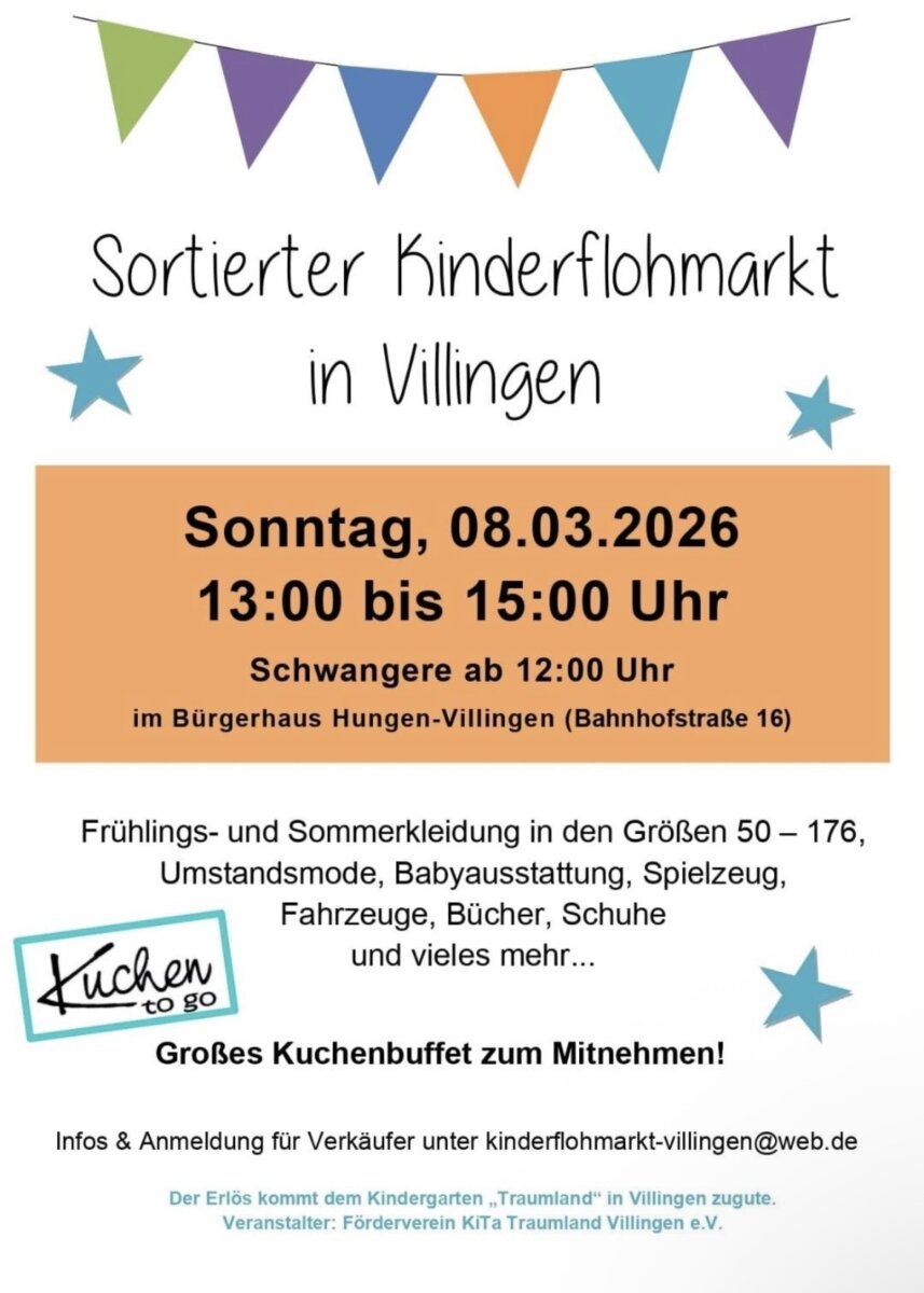 Der der Förderverein KiTa Traumland e.V. veranstaltet wieder seinen vorsortierten Kinderflohmarkt in Villingen! Am Sonntag, 08.03.2026 wird von 13:00 bis 15:00 Uhr im Bürgerhaus Villingen eine große Auswahl an Herbst- und Winterkleidung für Kinder, Babyausstattung, Umstandskleidung, Fahrzeugen, Büchern, Spielwaren u.v.m. angeboten. Einlass für Schwangere (auch mit Begleitperson) ist bereits um 12:00 Uhr. Der Erlös kommt dem Kindergarten […]