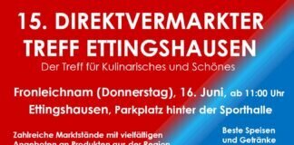 Am 16. Juni (Fronleichnam) findet zum 15. Mal der Direktvermarkter-Treff in Ettingshausen statt, und zwar von 11:00 bis 18:00 Uhr auf dem Parkplatz hinter...