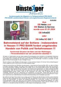 PRO BAHN Hessen gibt Sonderausgabe „Der Umsteiger aktuell“ zum „Bahnnotstand heraus - Bahnnotstand auf der Schiene - insbesondere in Hessen !!! PRO BAHN fordert umgehendes Handeln von Politik und Verkehrswesen !!! Schlimmste Situation der Bahn seit den Weltkriegen – Personalnotstand war seit Jahrzehnten absehbar !!!