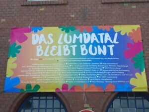 Das Lumdatal bleibt bunt – und PRO BAHN Mittelhessen ist mit dabei – Banner fordert zu Vielfalt an der Eingangsfassade am Kulturbahnhof Lollar auf